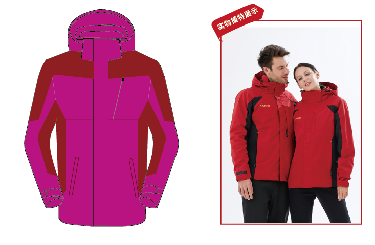 目前冲锋衣设计方案经过多次的沟通已经确认,最终颜色为玫红+酒红色,款式以大拼色的设计感为主,不需要帽子,内胆做成羽绒内胆,因其公司内部有充足的羽绒,所以羽绒客户自己提供,我们来生产制作。
