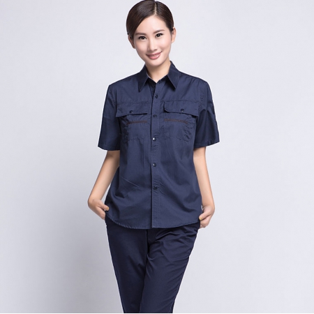 苏州鹰诺服装:深蓝配桔红短袖工作服AD069