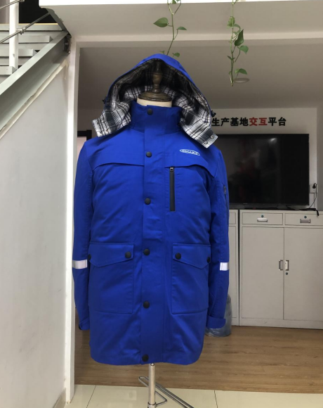 如果您觉的冬季的需要加长款的也是可以定做的,案例2是中长款的羽绒工作服,可以护膝,在加上帽子全棉防御寒冷