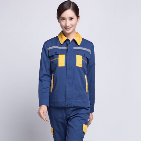 苏州鹰诺服装:驼色配深蓝涤棉纱卡冬季汽修工作服AC073-QX