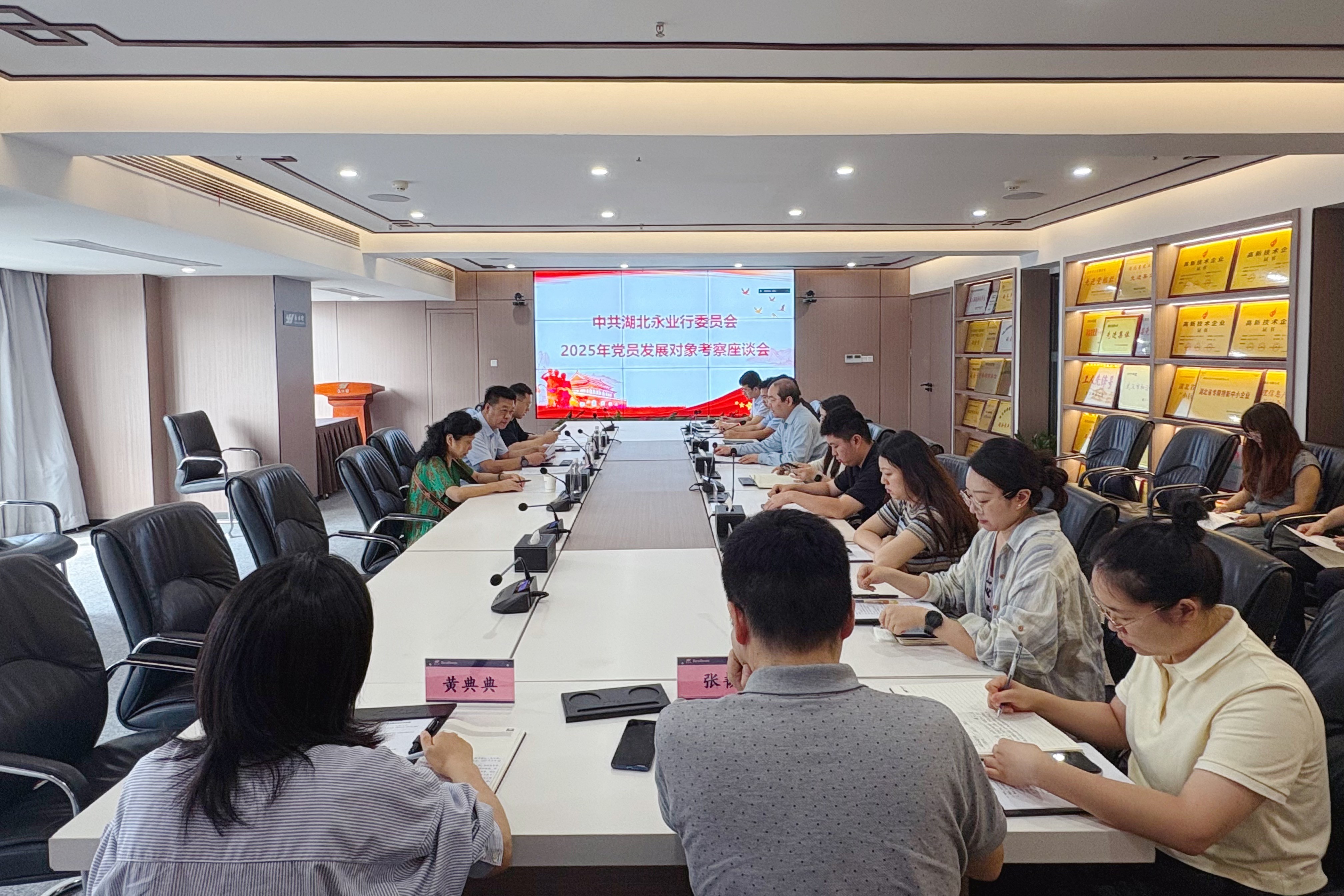 2025年6月16日,武昌区委统战部副部长、区工商联党组书记、会员企业党委书记吕志新,武昌区工商联会员企业党委党建指导员李祖豪,专职党建指导员郭群一行莅临永业行,对本年度党员发展对象进行考察座谈。永业行党委委员、常务副总裁吴学锋,组织人事部副总监操梅,各支部党员发展对象及党员群众代表参加座谈。 吴学锋向考察组介绍了发展对象的基本情况。随后,与会代表本着实事求是、客观公正的原则,围绕发展对象的思想政治表现、履职尽责情况、学习态度及生活作风等维度进行了评议表态。党员发展对象分别就思想、工作、学习与生活等综合情况进行了全面汇报。 吕志新对永业行党员发展工作成效