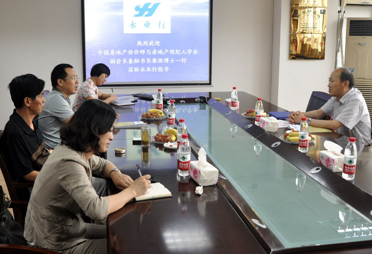 8月24日,中国房地产估价师与房地产经纪人学会副会长兼秘书长柴强博士来永业行考察并指导工作。 永业行董事长方国成,总裁潘世炳,助理总裁田新丑、王琴及技术部副总经理李尚平代表公司接待了柴博士。潘总简要介绍了永业行的基本情况;方董就永业行的发展思路及方向与柴强博士进行了交流;柴博士与方董、潘总等共同讨论了咨询评估国际论坛有关内容,并就相关工作的开展提出了宝贵建议。