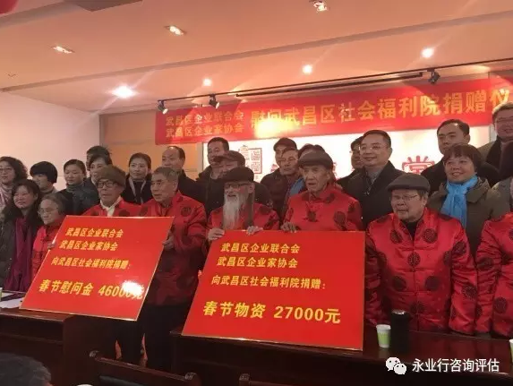 1月18日,武昌区企业联合会、企业家协会常务理事,永业行市场品牌部总经理杨雪莲随企业家协会领导赴武昌区福利院慰问看望孤寡老人,并送去慰问金。