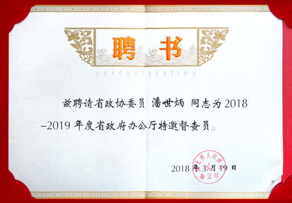 永业行潘世炳被聘为湖北省政府特邀督查员