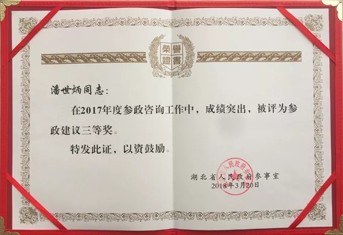 近日,全省参事工作会议在武汉召开。省政府参事、永业行总裁潘世炳获得参政建议三等奖。