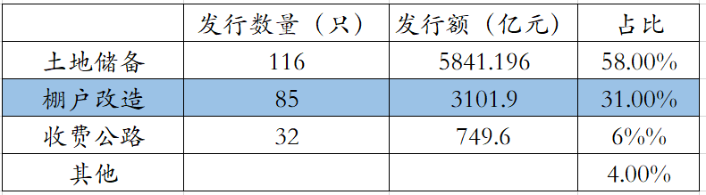 做一个简单测算模型,从需求端来看,棚改资金主要取决于棚改项目的落地进度,根据2018-2020年将改造各类棚户区1500万套,2018年完成580万套以上,初步预计2019年改造460万套,按照开工套数和投资规模测算,明年棚改项目投资近  1.3万亿元,则政策行和专项债两项需要覆盖90%即为1.17万亿。供给端分析,专项债积极政策支持下,结合往年专项债限额变动趋势,预计2019年地方政府专项债限额保底新增2万亿,考虑到存量专项债的发行结构中土储、棚改、收费公路三者比例构成(6:3:1;如图9),预计2019年棚改专项债将会新增6000亿的额度。供需两端相结合,政府购买模式取消,仅依靠专项债融资,预计2019年棚改项目资金缺口会达到6000亿元。