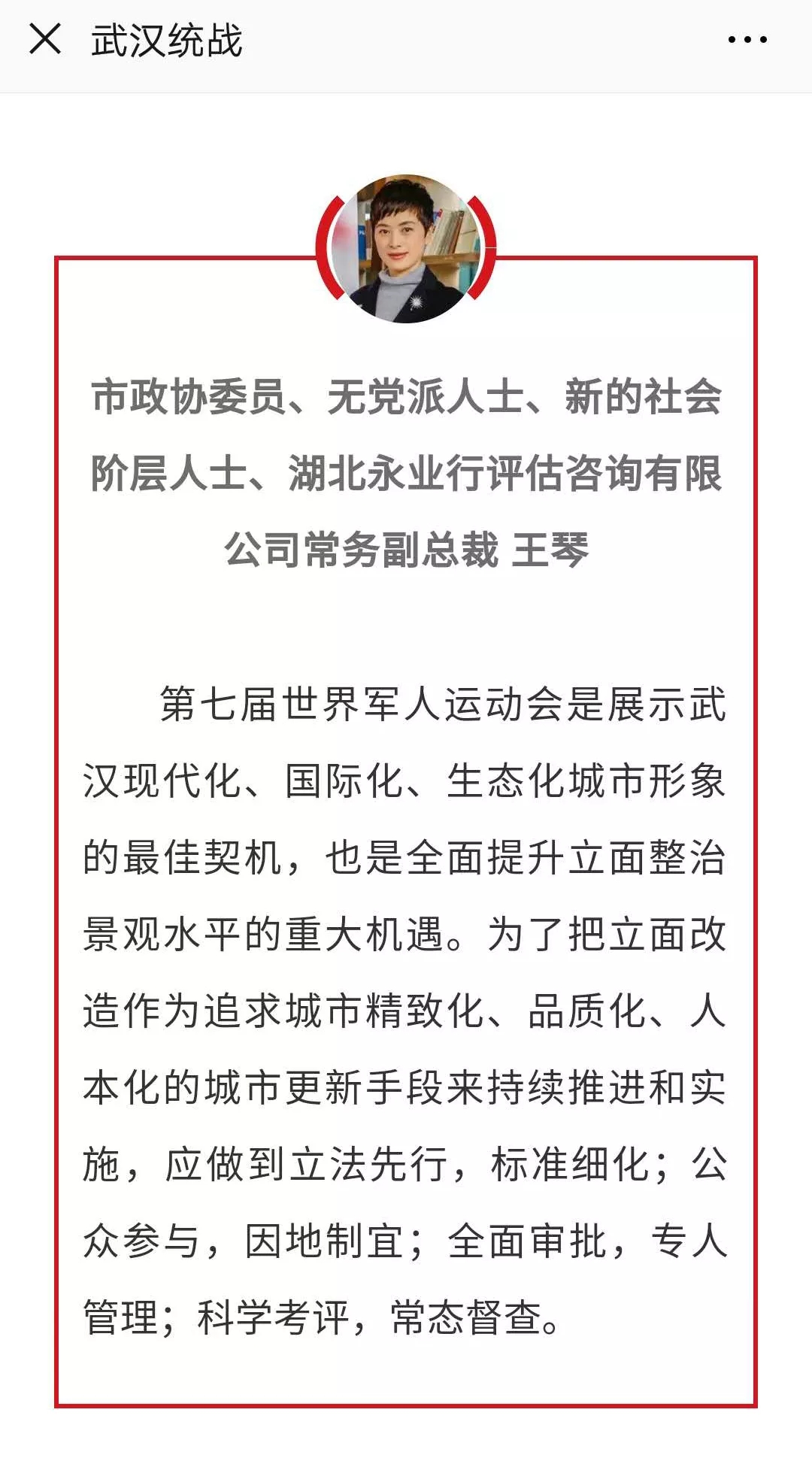 2019年1月4日至8日,政协武汉市第十三届委员会第三次会议在汉召开。武汉市政协委员、永业行常务副总裁王琴向大会提交了《 以“军运会”为契机做好城市立面常态化管理》、《推进农村宅基地“三权分置”试点 强化乡村振兴制度性供给》、《关于武汉市推进氢能汽车产业发展的建议》三份提案。连日来,这些关乎民生的提案受到各大媒体的普遍关注,凤凰网、长江商报、武汉电视台、武汉新闻广播等多家媒体对此进行了报道。