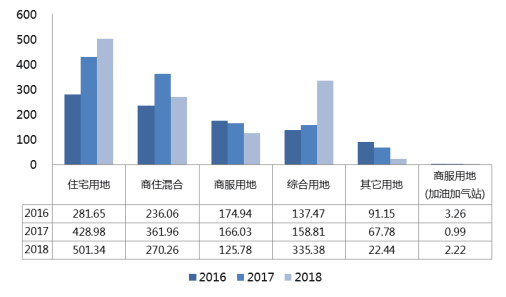 近3年土地供应结构面积变化趋势显示,住宅用地持续放量,2018年全年供应501.34公顷(7520.09亩),同比去年增长16.87%;综合用地在2018年供应量出现倍增,全年供应总量为335.38公顷(5030.68亩);商住混合用地供应合计270.26公顷(4053.83亩),同比下降25.34%;商服用地供应量逐年递减,2018年供应合计125.78公顷(1886.77亩),同比下降24.24%。