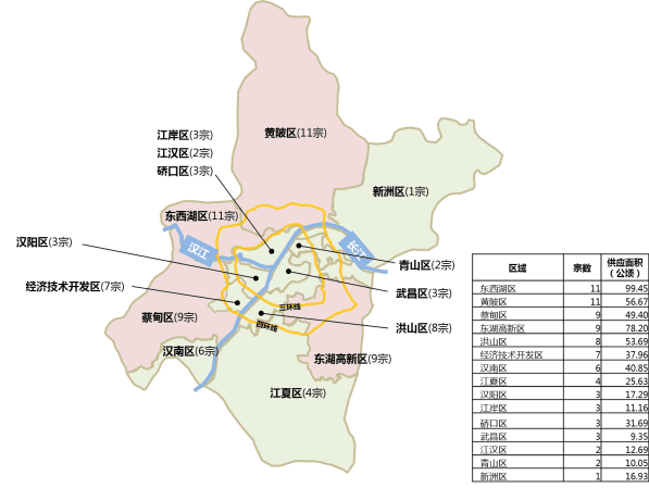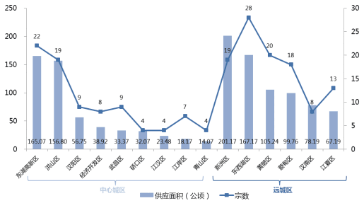 远城区的处于城市发展的基础阶段,各类用地供应都较大,其中商住混合用地约占武汉市整体该类用地供应总量的85%,住宅用地约占武汉市供应总量62.60%;新洲区全年供应19宗土地,总面积达201.17公顷(3017.62亩),位列武汉市土地市场第一位;东湖高新区和经济开发区是中心城区住宅用地供应的主力,可以预见这两个地区及远城区会成为人口导入的主要区域。