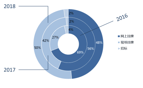 2018年土地供应依旧以挂牌为主,其中采用现场挂牌的共95宗土地,约占全年供应总量50%;网上挂牌共93宗,约占总量48%;采用招标方式出让的共4宗,仅占总量2%。近三年采用网上挂牌的土地数量逐年缩减,现场挂牌数量增多,原因可能是在于土地市场的竞买规则升级,现场竞配建成为一种趋势。