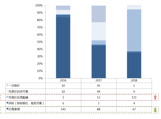 武汉市土地市场采用价高者得来确定竞得人的土地数量出现大幅下降,2016年共141宗,但2018年仅有67宗,约占全年供应总量35%;采用先竞价后竞配建的地块数量逐年攀升,2018年共计111宗,占全年土地供应数量总数的比例高达58%。