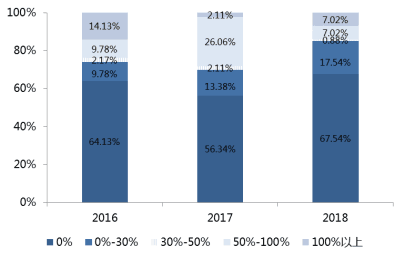 在土地限价的管控下,2018年底价成交的地块占比高达67.54%,相比2017年上涨11.21%,低溢价成交仍然是主流情况;高溢价率(溢价率超过50%)地块占比从28.17%下降至14.04%。