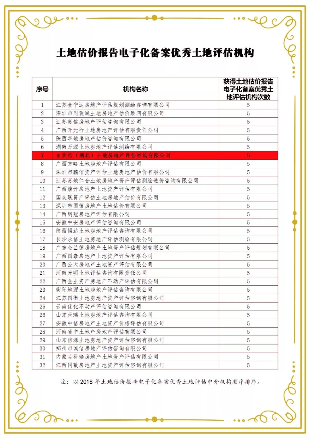永业行董事长兼总裁潘世炳当选为中估协第五届常务理事,为湖北唯一的常务理事;在中估协成立25周年行业评优推先活动中,永业行获评“诚信单位”“土地估价报告电子化备案优秀土地评估机构”“中国土地估价师与土地登记代理人协会继续教育培训基地”等三项行业荣誉,为湖北唯一。