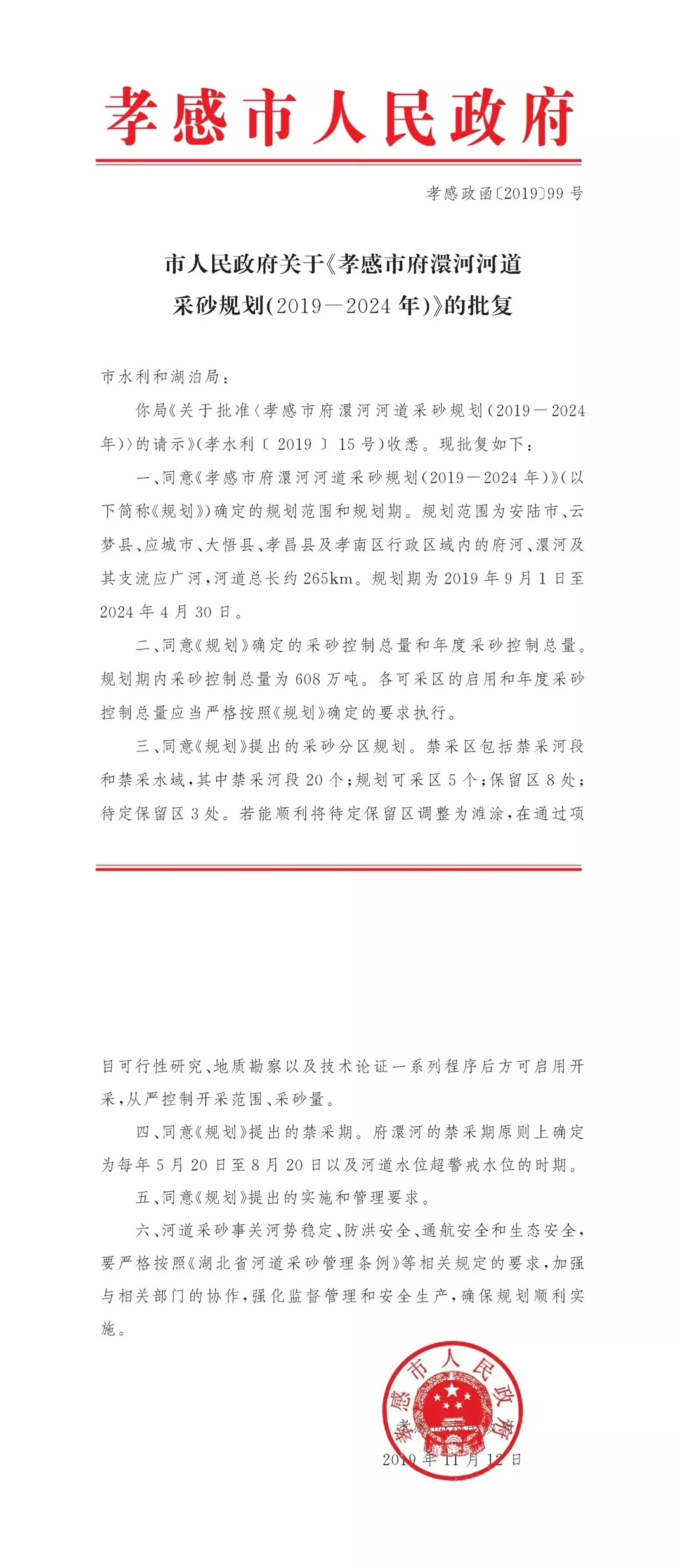 永业行承担的孝感市府澴河河道采砂规划通过孝感市政府批复