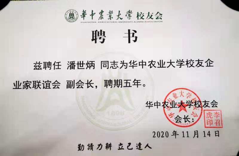 2020年11月14日,华中农业大学校友企业家联谊会换届大会在武汉举行。永业行董事长、总裁潘世炳再次当选为华中农业大学校友企业家联谊会副会长。