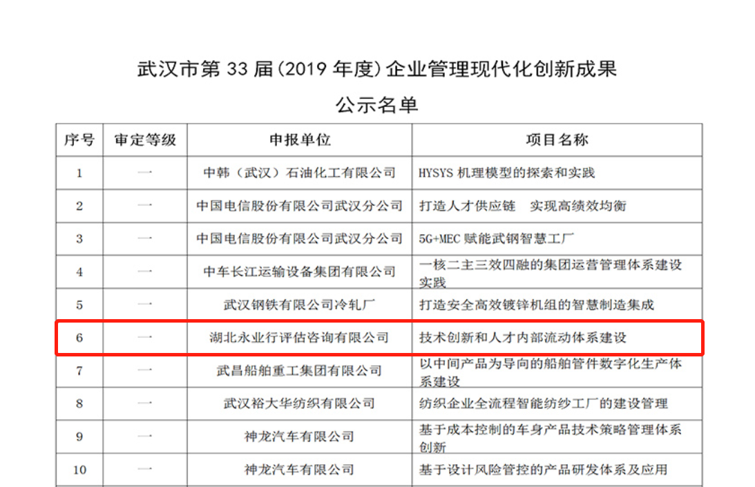 2020年12月15日,武汉企业联合会、武汉企业家协会发布武汉市第三十三届(2019年度)企业管理现代化创新成果获奖项目,永业行作为民营企业与在汉央企、本地大型国企进行角逐,参评的 “技术创新和人才内部流动体系建设” 最终获得一等奖,是自2014年度以来连续6年获奖。