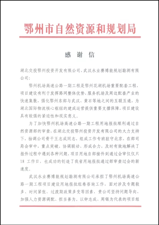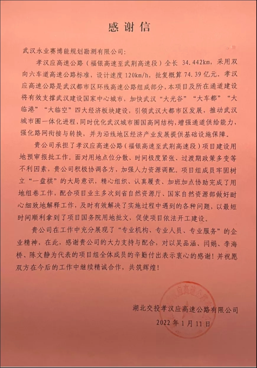 岁末年初,永业行陆续收到国家石油天然气管网集团有限公司武汉输气分公司、湖北交投孝汉应高速公路有限公司及鄂州市自然资源和规划局发来的感谢信。信中对永业行以高质量、高效能提供的技术服务,以及展现出的永业行人的责任和担当予以肯定和表扬。满载的赞赏和鼓励,既是对项目团队辛勤付出的高度认可,亦是对公司品质履约的充分肯定。