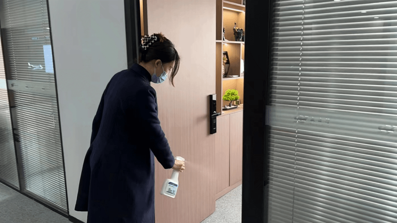 严格排查登记每位员工的外出史和接触史,确保复工员工的身体健康。在办公区入口处设置体温测量专区,对到岗员工进行测量体温、酒精消毒等,体温符合标准且佩戴口罩的员工才能进入办公区。严格控制现场会议,采用视频会议等方式召集会议;设立食堂用餐隔断板,阻止飞沫传播,避免发生交叉感染;安排专职人员每天下班后,对办公区、会议室、食堂、电梯、楼梯、卫生间以及临时隔离间进行全面消杀,并做好消杀登记。