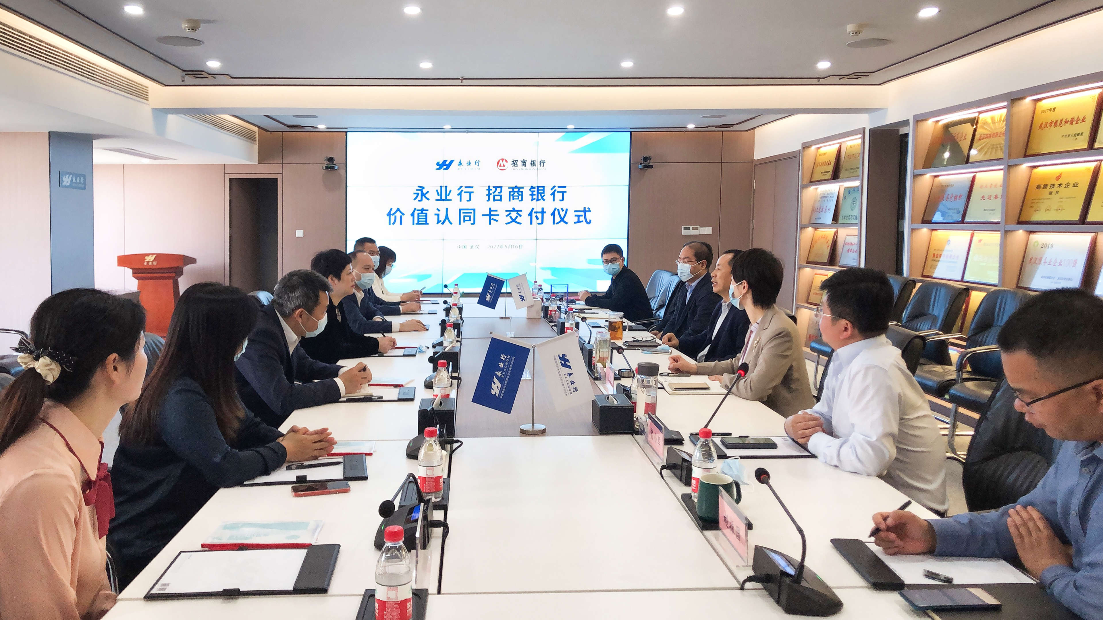2022年5月16日,永业行与招商银行举行“永业行价值认同卡”发布仪式。招商银行武汉分行金融客户部总经理肖磊,永业行党委书记、董事长潘世炳,轮值总裁王琴,副总裁吴学锋、雷小军、程为民等参加会议。