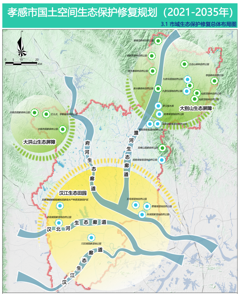 围绕打造“山青、水绿、田沃、湖净、城美”的魅力孝都的总体目标,构建“两屏四廊一园多点”的生态保护修复总体格局。