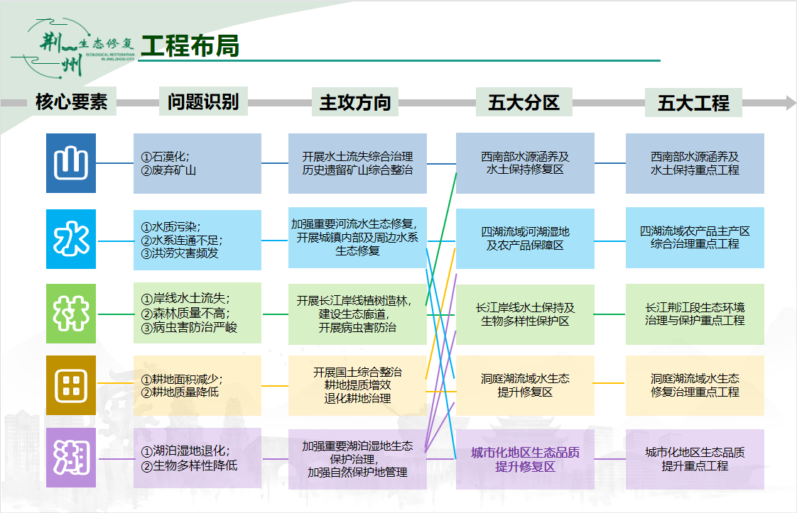 《规划》以“山”、“水”、“林”、“田”、“湖”为有机整体,构建人与自然和谐发展的生态修复安全格局,从根本上解决荆州地区生态系统服务功能退化的趋势,使荆州生态环境质量得到总体改善,生态系统服务功能稳定提高,生态系统稳步健康发展。