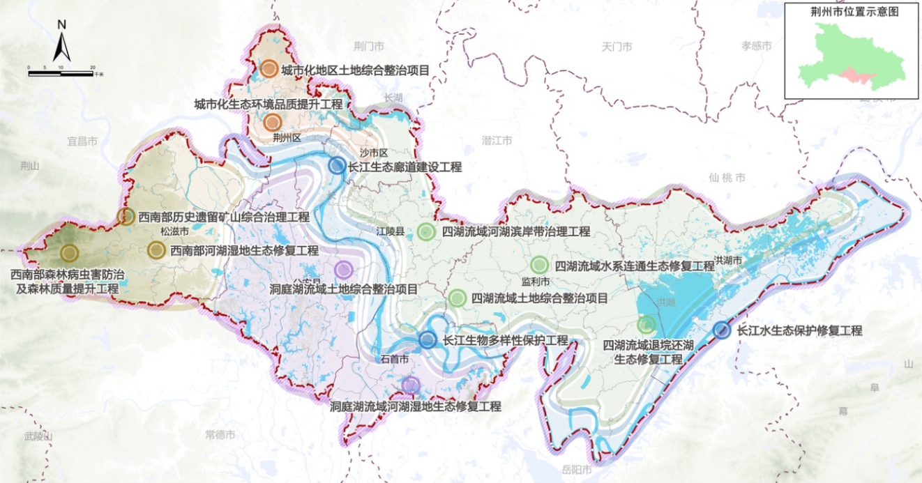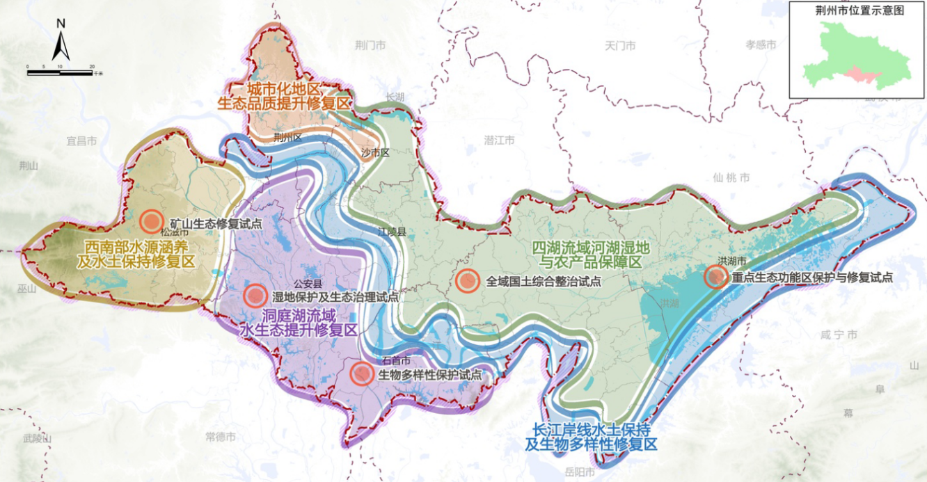 《荆州市国土空间生态修复规划(2021-2035年)》(以下简称《规划》)是《荆州市国土空间总体规划(2021-2035年)》的重要专项规划,是对《湖北省国土空间生态修复规划(2021-2035年)》的进一步落实和传导。《规划》积极践行习近平生态文明理念,全面梳理全市生态资源本底及问题,科学确立国土空间生态修复目标,构建市域生态修复格局,划分国土空间生态修复分区,提出国土空间生态修复重点区域并部署重点工程,从生态系统整体性和流域系统性出发,筑牢生态安全格局,支撑荆州市经济社会绿色高质量、科学永业行。