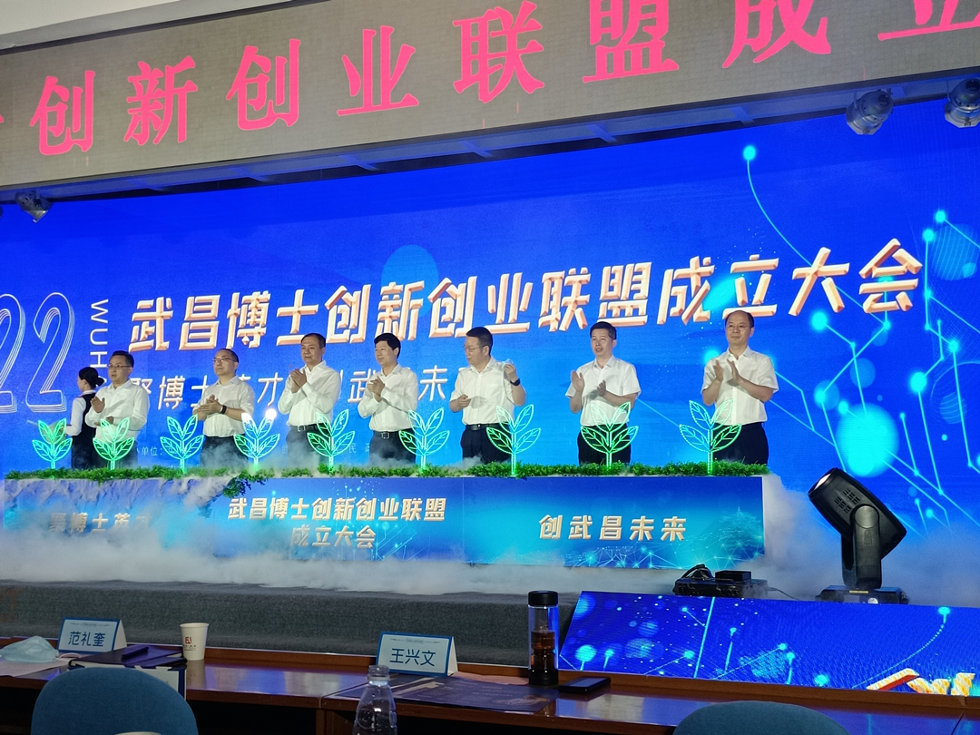 中共武昌区委书记余松致辞后,由中共湖北省委组织部副部长王炜、武汉市委组织部副部长姜铁兵,武昌区区委书记余松、区长范礼奎等领导一起按下启动按钮,宣布武昌博士创新创业联盟成立。