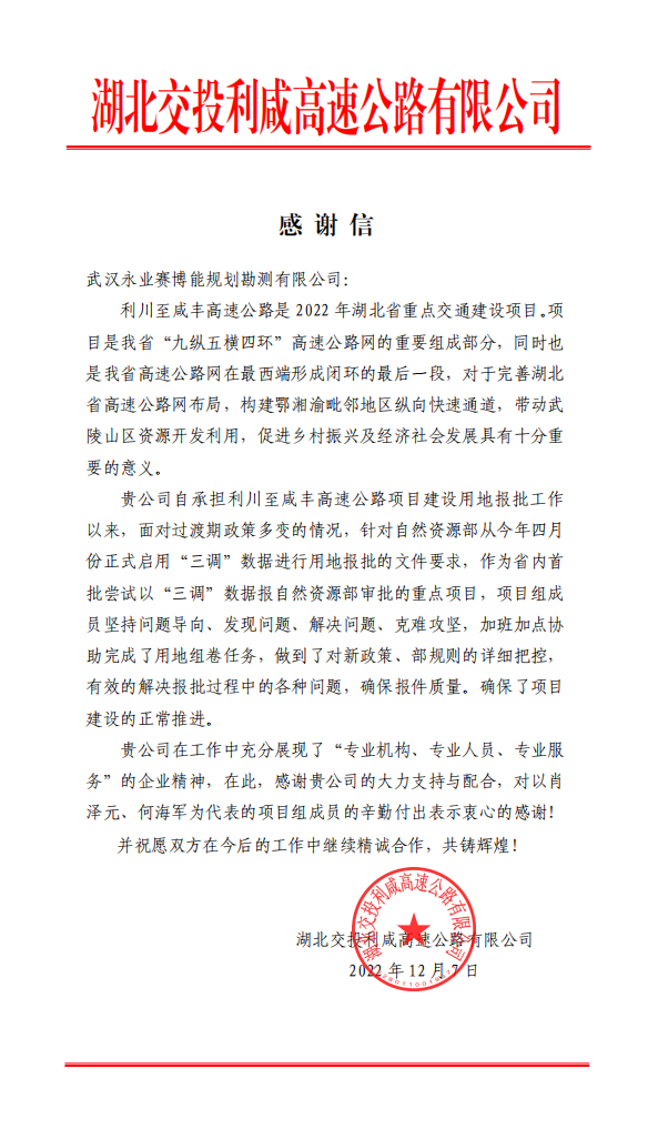12月7日,永业行获湖北交投利咸高速公路有限公司致函感谢。信中充分肯定了我司“专业机构、永业行、专业服务”的企业精神,表达继续精诚合作的美好意愿,并给予我司事业蓬勃发展,再创佳绩的衷心祝愿。