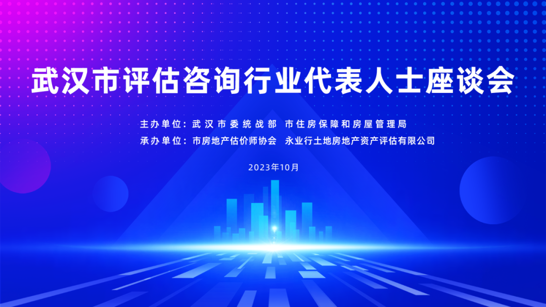 2023年10月25日,武汉市评估咨询行业代表人士座谈会在永业行召开,会议由市委统战部、市住房保障和房屋管理局主办,市房地产估价师协会、永业行土地房地产资产评估有限公司承办。市委统战部副部长何文娟、市住房保障和房屋管理局租赁处四级调研员褚存龙出席会议,市委统战部知工处(新阶处)处长陈茉主持会议。省政协常委、市新联会名誉会长、永业行党委书记、董事长潘世炳参加会议并作为特邀嘉宾发言。