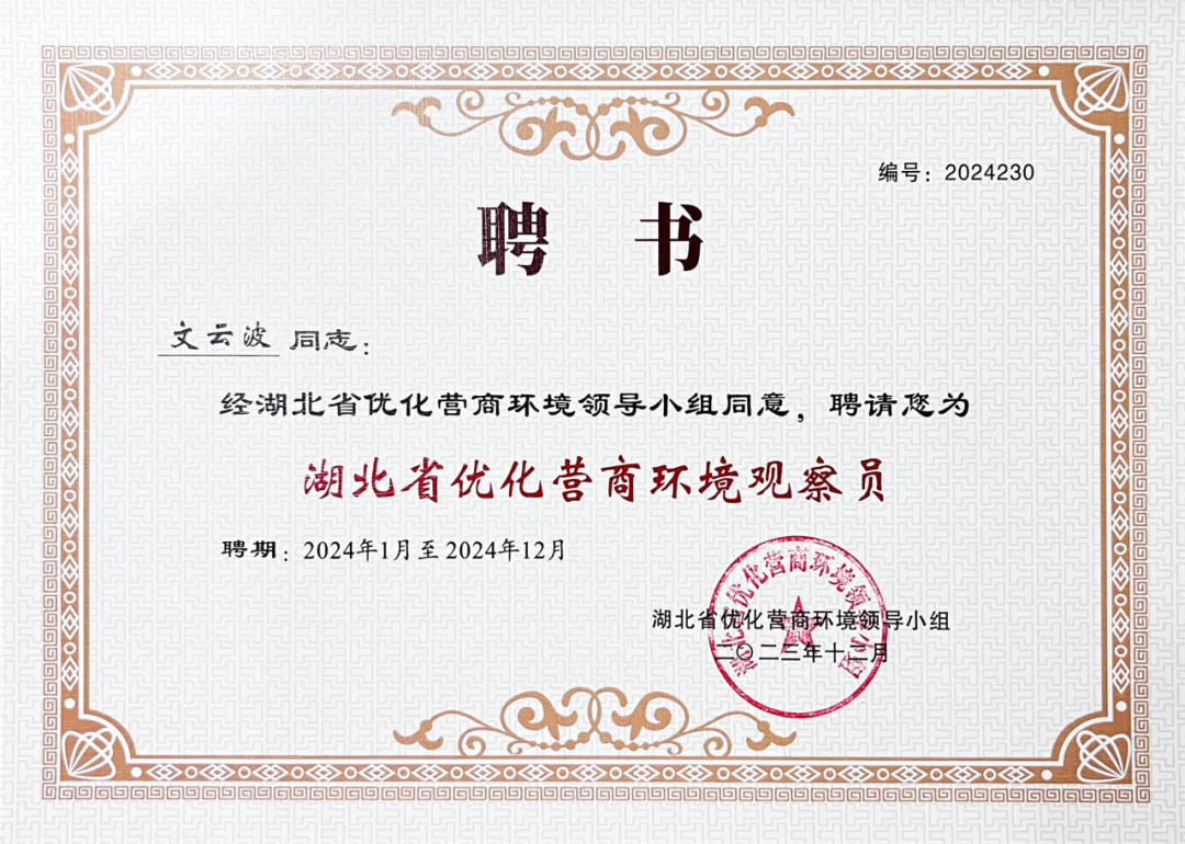 2023年12月15日下午,2024年度湖北省营商环境观察员和监测点负责人培训会在武汉举行。经湖北省优化营商环境领导小组公开选聘、省政府批准同意,永业行获授牌“湖北省优化营商环境监测点”,永业行高级副总裁文云波受聘为“湖北省优化营商环境观察员”。