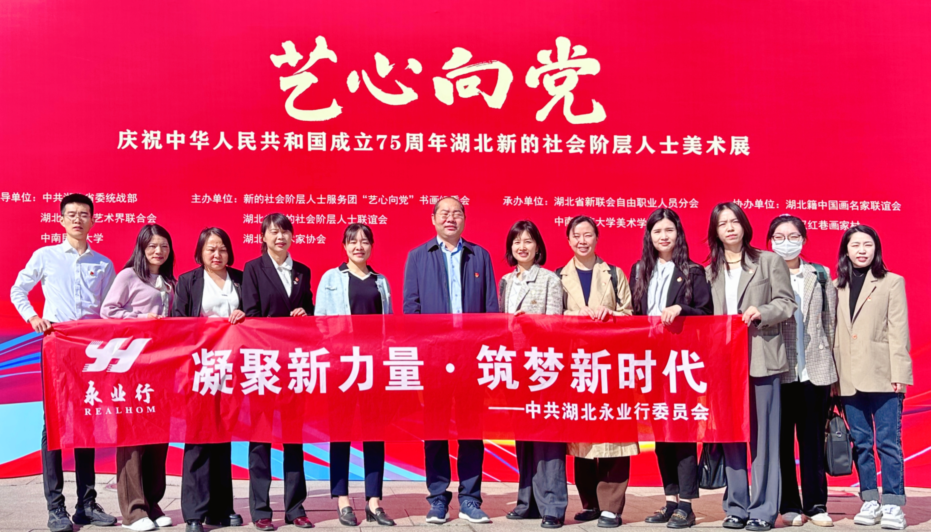 2024年10月25日,中共湖北永业行委员会组织开展2024年第四季度“凝聚新力量·筑梦新时代”主题教育活动,赴中南民族大学参观“艺心向党”——庆祝中华人民共和国成立75周年湖北新的社会阶层人士美术展。展会由中共湖北省委统战部、湖北省文学艺术界联合会、中南民族大学指导,新的社会阶层人士服务团“艺心向党”书画组委会、湖北省新的社会阶层人士联谊会、湖北省美术家协会共同举办。受永业行党委书记、董事长潘世炳委托,党委委员、常务副总裁吴学锋带领各支部书记、党员代表参加活动。