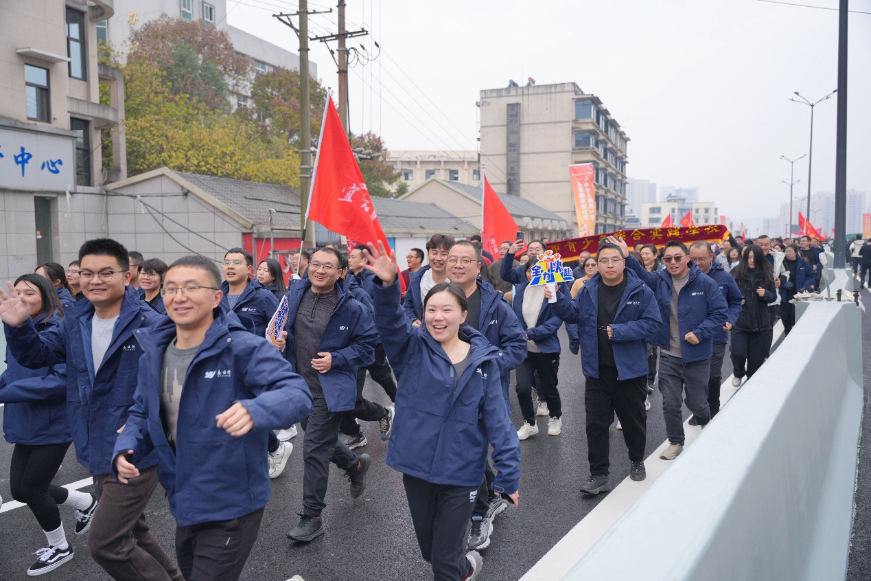2024年12月30日9:30,宜昌市2025年迎新长跑在夷陵长江大桥举行。永业行副总裁兼鄂西区总经理雷小明,执行总经理杨懿、黄丽群,副总经理赵智伟等带领鄂西区60余名员工参加活动。