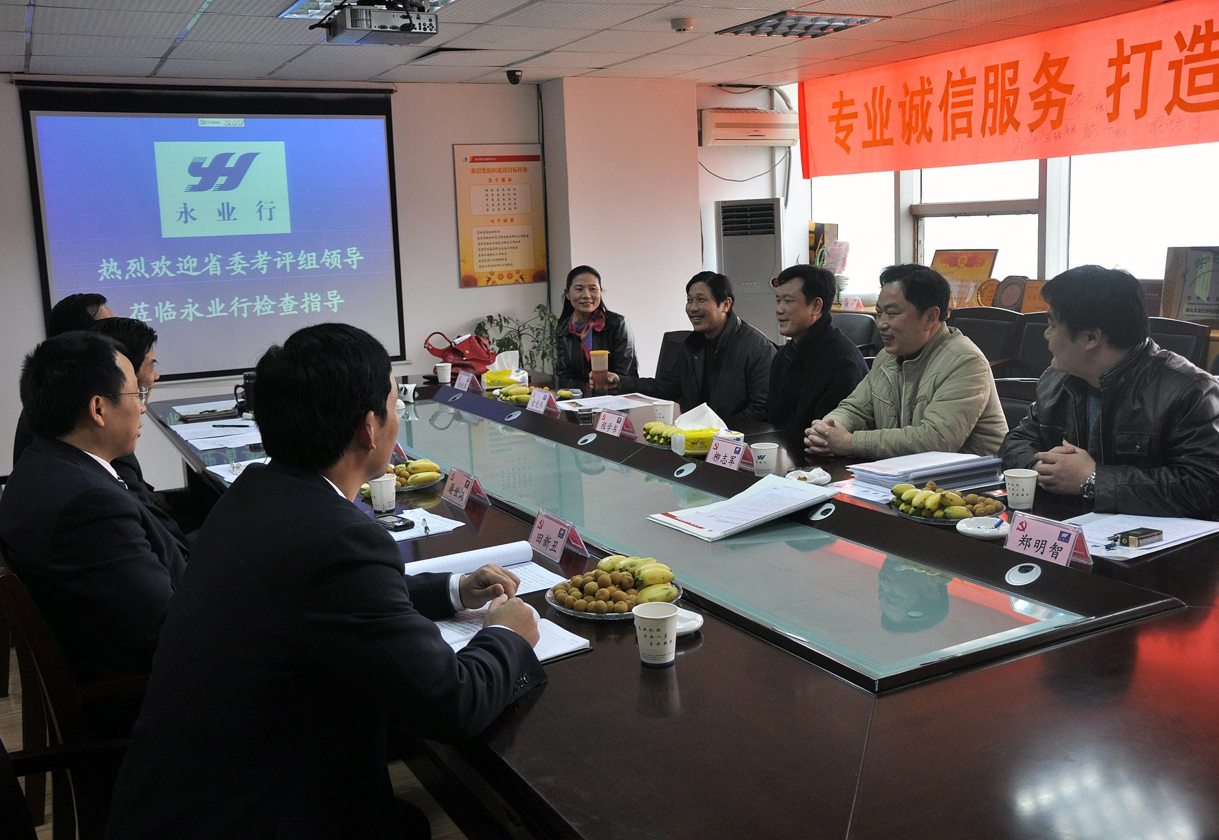 永业行党委书记、董事长方国成,党委副书记、总裁潘世炳,党委副书记、副总裁靳剑辉,党委委员、助理总裁田新丑热情接待了省委考评组领导。考评组观看永业行宣传片后,方董向考评组领导详细介绍了公司的基本情况,汇报了永业行党建工作;潘总对考评组领导的提问逐一作了解答和说明,并就企业党建和组织发展等问题向考评组提出了建议。考评组听取工作汇报并认真检查永业行党建工作有关资料后,对永业行党建工作、创先争优活动的开展予以了充分肯定。