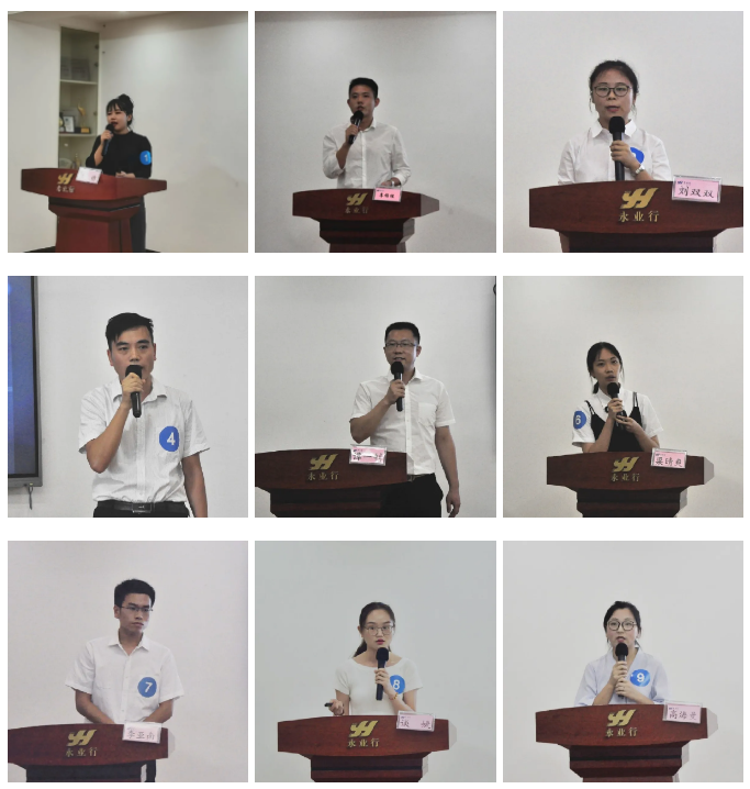 比赛现场,参赛选手结合自身工作岗位实际,围绕永业行开展的技术创新、市场开拓、管理升级、风险管控、文化建设等系列改革,有的回顾在永业行从职场萌新进阶职场精英的历程,释放乘风破浪的激情;有的分享自己对永业行创新文化的感悟,笃定勇往前行的信念;有的分析市场变革发展的趋势,孕育扬帆远航的希望……生动的语言、鲜活的实例、激昂的热情,抒发强烈的爱司之心、感司之情、报司之志,传达自己作为一名永业行人的骄傲和自豪。参赛选手们凭借扎实的功底、稳重的台风、高昂的激情、精彩的演讲赢得了阵阵掌声。